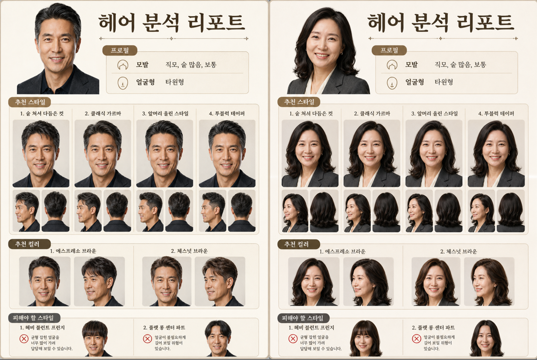얼굴형, 모발 상태, 피부톤을 복합 분석합니다.
